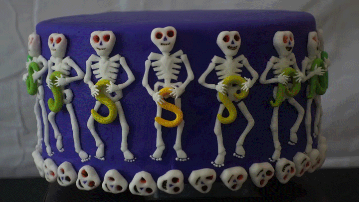 I could then make the skeletons by pushing pieces of white fondant into the mold and sticking them onto the cake. The skeletons are holding letters that morph from the letter “S” to the letter “A” to the letter “M” to spell “Sam.”