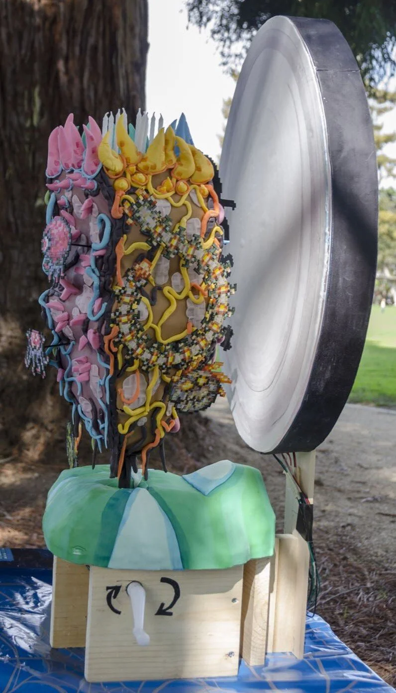 The memories around the edge of the 9 are gelatin bubbles, which are made by dipping partially inflated balloons, coated with shortening, into melted gelatin. They’re surprisingly sturdy once dry and technically edible, though it’s a little like eating plastic.