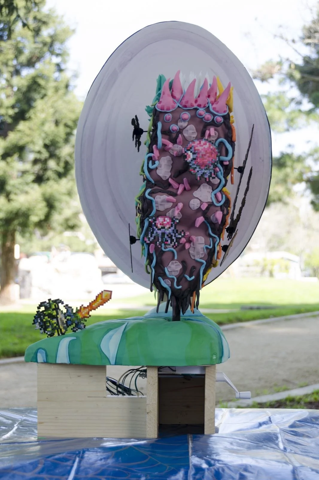The tasting menu began with a single pea and included pea flavored gum, pea flavored soda, and pea flavored jello. At the end of the play, the corpse of Woyzeck’s murdered lover Marie was lowered from the ceiling. The corpse was made of styrofoam, but I used fondant to decorate it as I would a cake. The open chest cavity was full of pea-flavored cake balls. As the audience filed out of the theater, they were invited to take a cake ball from the corpse.