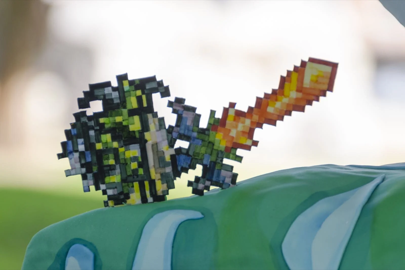 Fortunately, after Sam’s last Terraria cake, I am expert at painting pixel-y gum paste Terraria characters. The guy on the side is Alex’s avatar, with a Horseman’s Blade, which she specifically requested.