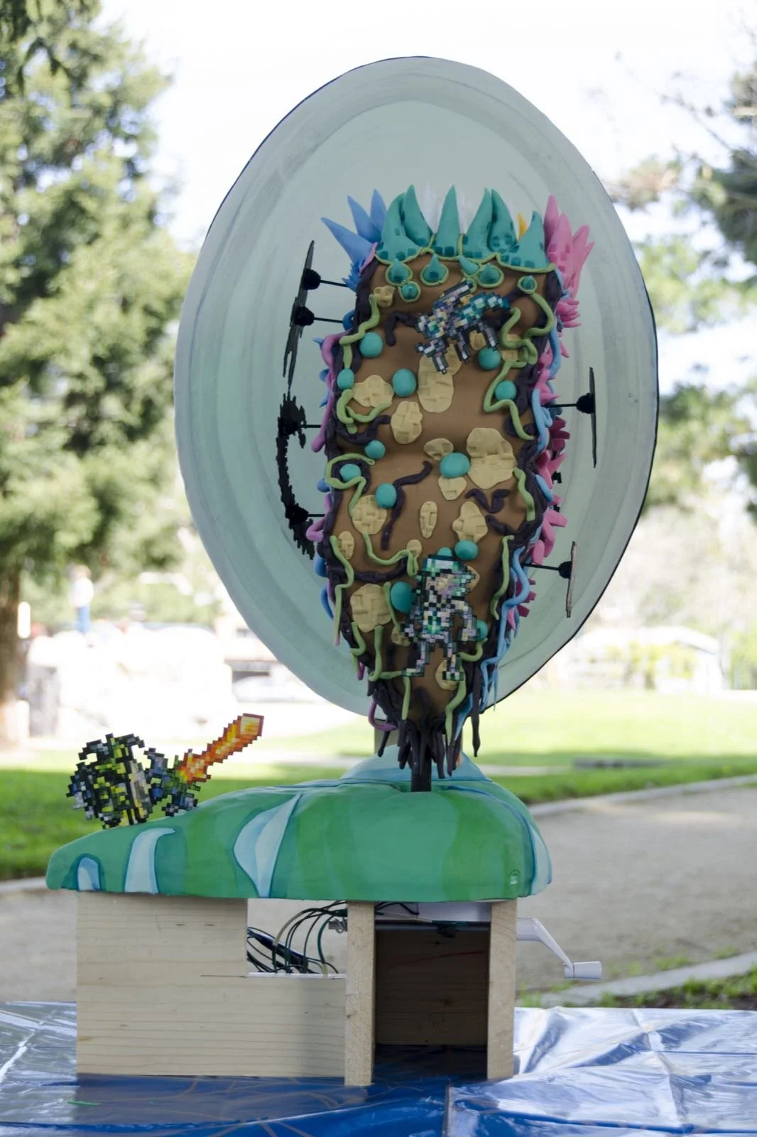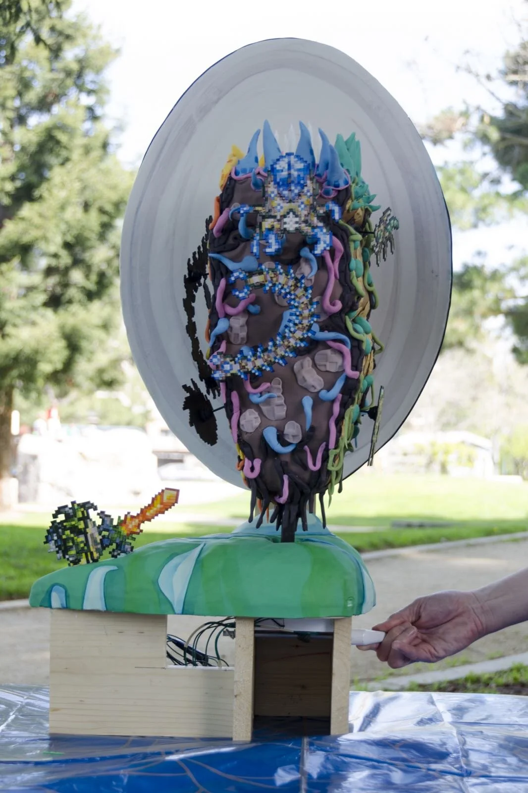 I wanted to make the backdrop change color to correspond with the celestial event phase, so I made a light box like the one I made for the Terraria Blood Moon Cake. Inside are strips of LED tape in pink, yellow, blue, and green. When the cake turned, a strip of copper tape on the gear created electrical connections that lit the appropriate color LEDs as each side of the pillar came to the fore. It quite well at home, but the party was outside on a sunny day, so with that much ambient light the color change was virtually imperceptible.
