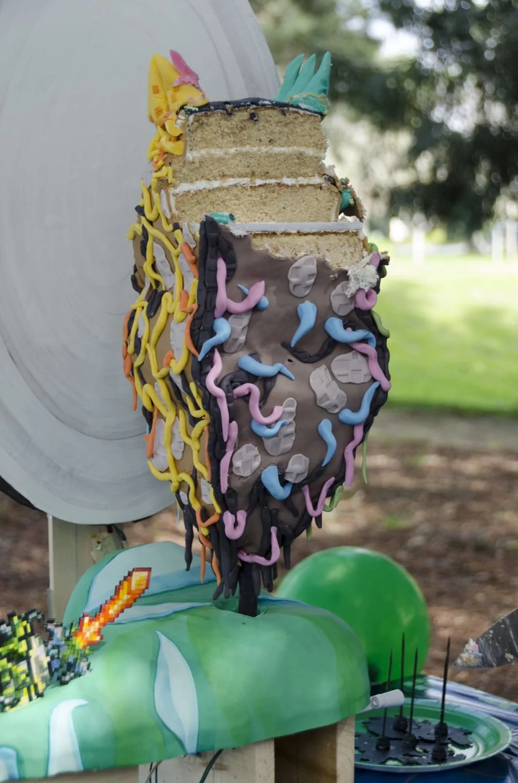 The legs and arms are wood, the head, body, cake, and big grass blocks are cake. There are LEDs behind the eyes, which are covered with several layers of wafer paper and then a layer of purple gelatin sheet. Everything is covered with gum paste plaques. To get the crucial minecraft pixel texture, I cut stencils for every color and airbrushed them. The Enderman only took eighteen separate stencils; the cake took eight; the grass blocks took fifteen (five for the tops, ten for the sides).