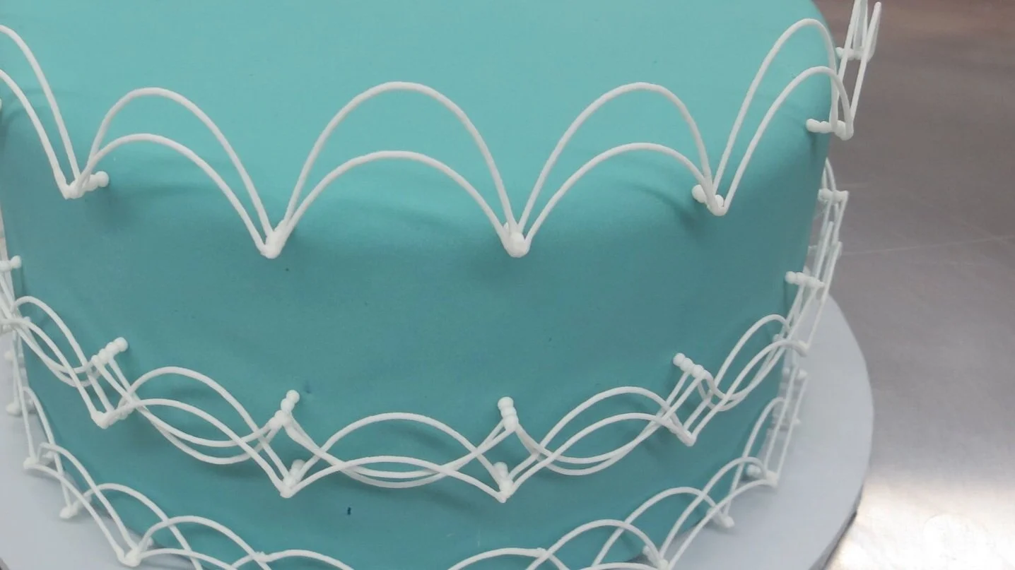 I put just a little more color into the cake by adding dusty rose royal icing fringe to the hanging cake bases and to the drapery, as well as some fondant ropes and tassels. Once these dried, I painted a little bright red and a touch of blue onto them.