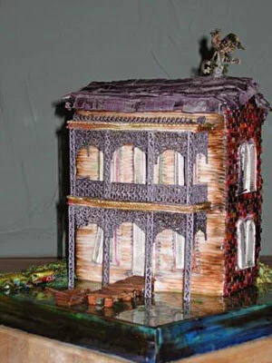 Now it was time to make the finishing touches - a little rowboat and oars, the pier for it to dock at, and the giant alligator to menace anyone who might be foolish enough to venture forth into the ominous swamp around the house. All these I sculpted from fondant, white for the alligator, marbleized brown for the rowboat and pier.