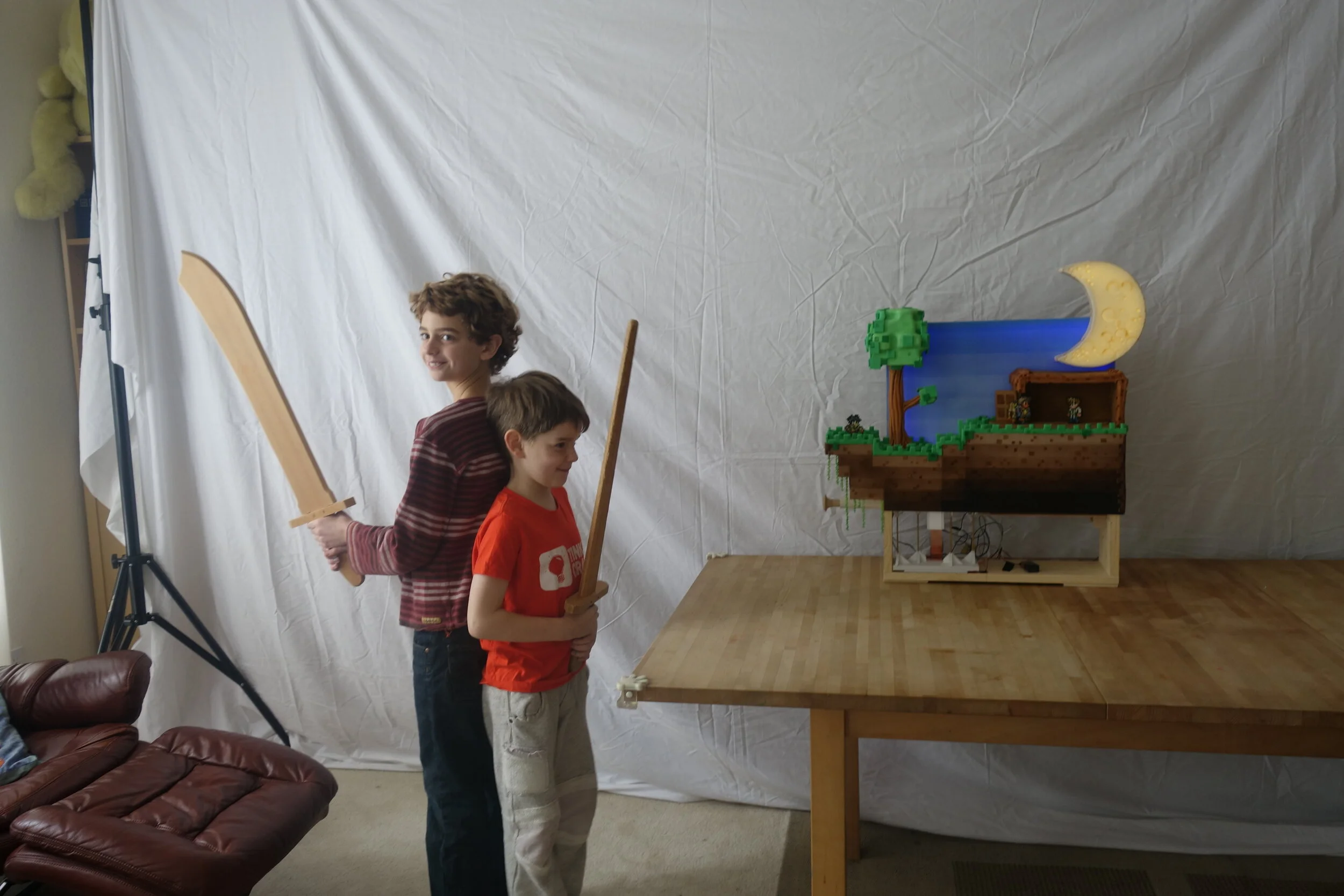 Sam also wanted his Terraria avatar and the guide NPC, so I included a little house made of gingerbread where they can hide from the zombies and mounted them on a track so they can walk back and forth.