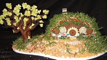 While it's true that a hobbit hole can be made with only two pieces of gingerbread (one flat with round doors and windows for the front, one draped over a bowl for the hill) I actually made several more pieces of gingerbread. In order to create a smoother transition from the base to the hole I made a few irregularly shaped blobbies to build up a slight mound underneath the hole proper. I also made a few small gingerbread circles for the shutters and the door, scoring them before baking to give them a weathered woodgrain texture. Finally, I shaped two pieces of gingerbread to make a tree for the yard. I won't say that it was meant to be the Party Tree, since we all know the Party Tree was cut down, but I imagine any self-respecting hobbit would want a nice tree in the yard.