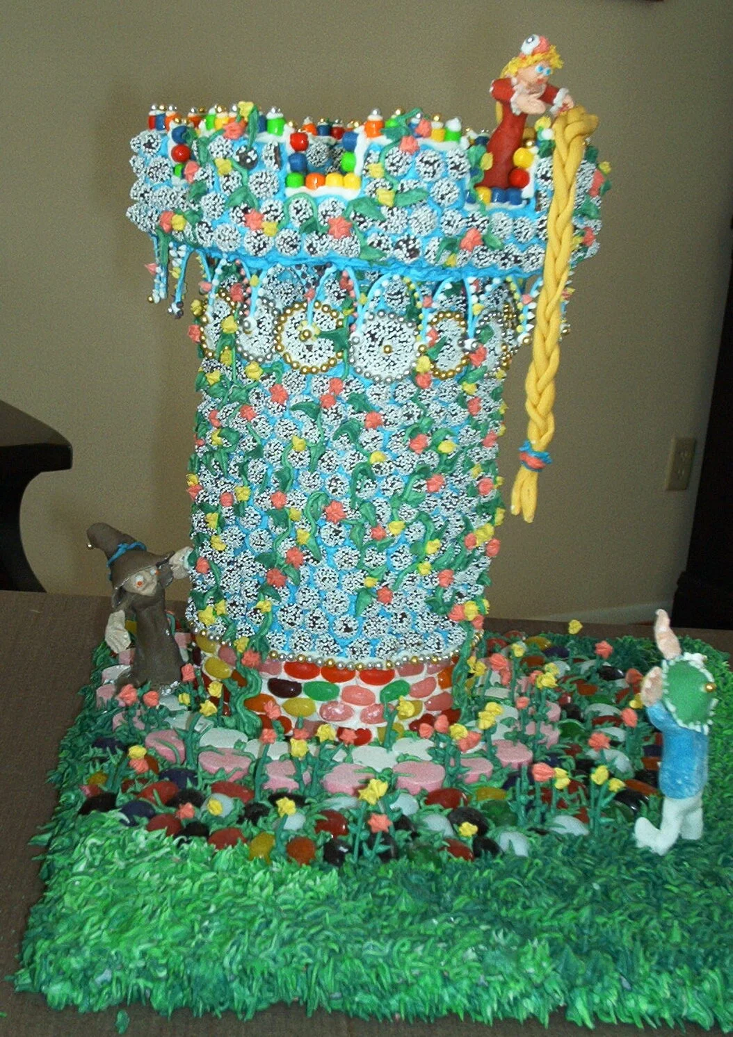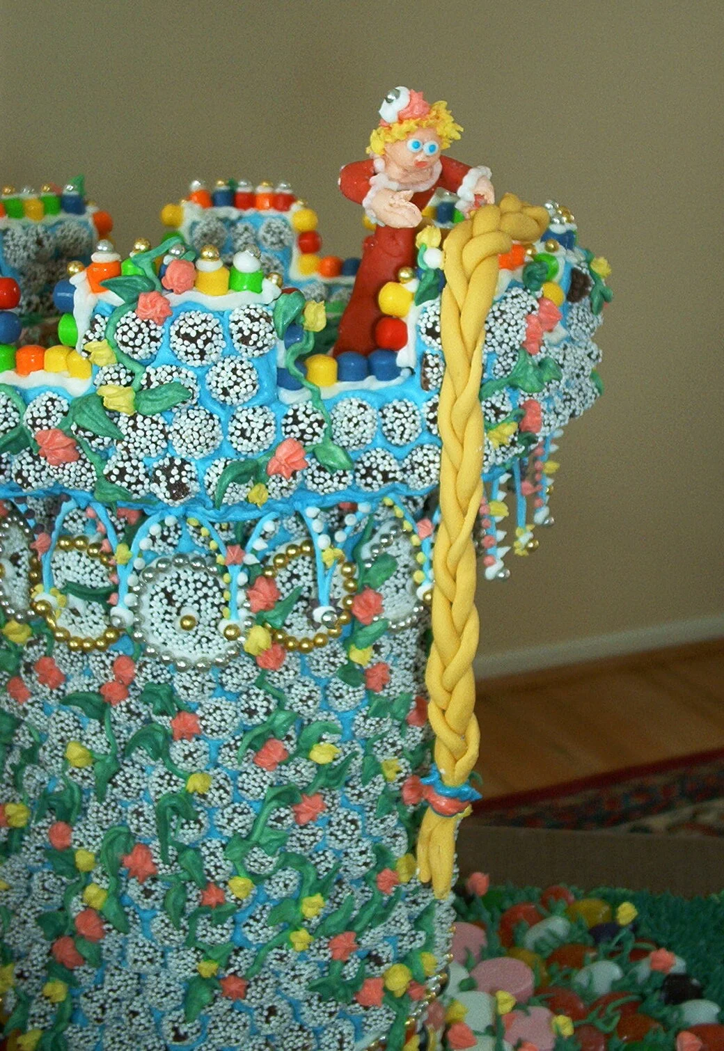 Candies used: Large and small jelly beans, pink and white mint lozenges, Snowcaps, large and small nonpareils, Necco wafers, chocolate rocks, Tart N Tinies, gold and silver dragees, rainbow sprinkles, royal icing, rolled fondant. I assembled the tower then covered it with jelly beans and nonpareils. I then added details like Tart N Tinies and dragees and drew vines and flowers on the tower with royal icing. I drew the flowers and the hanging tower details with royal icing on wax paper. After they dried, I attached them. The grass is royal icing, applied with a grass decorating tip, with individual blades added between the "paving stones." Rapunzel, the prince, and the witch are colored rolled fondant, which I made from scratch, with royal icing details and rainbow sprinkle irises.