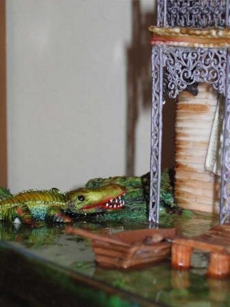 Before I could place the alligator I had to paint it. I used shades of yellow, red, brown, and green food coloring, then added tiny royal icing ridges to his back and royal icing teeth to his mouth with a #1 decorator tip. He was then ready to effectively menace the inhabitants of the swamp house! I set him in place on the edge of the swamp.