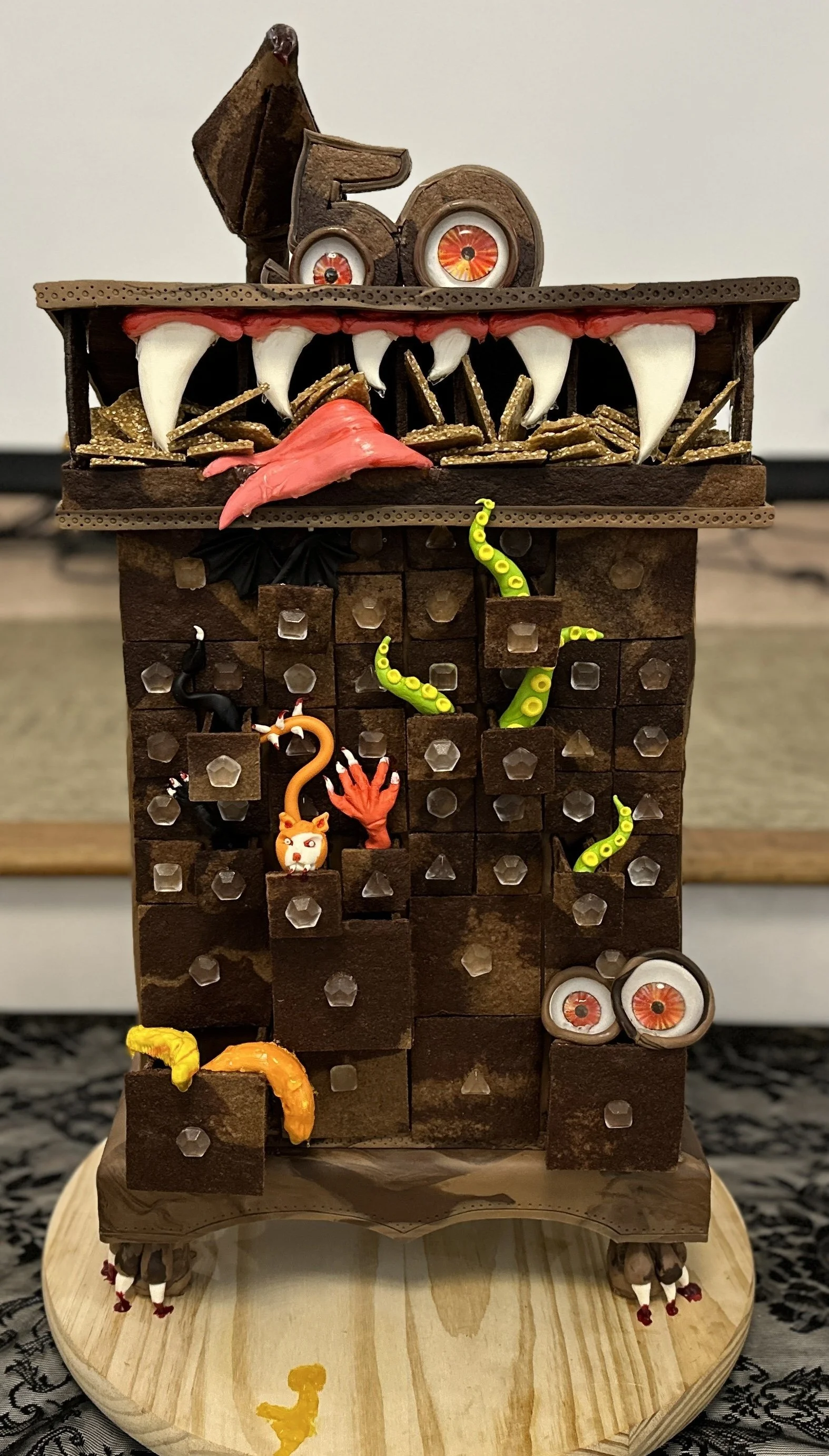 I made this cake for my sister’s 50th birthday party. It’s an armoire that is also a monster and also has other monsters emerging from its drawers.