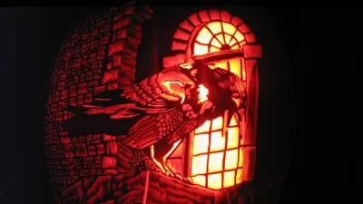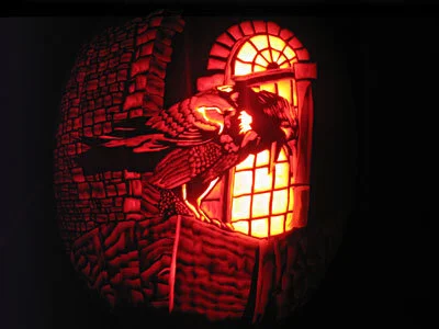 In my 11th consecutive year of entering the Pumpkinmasters carving contest, this is the pumpkin that finally won me the Grand Prize! Inspired by the ravens at the Tower of London, I think it represented my most effective use of textures to date.
