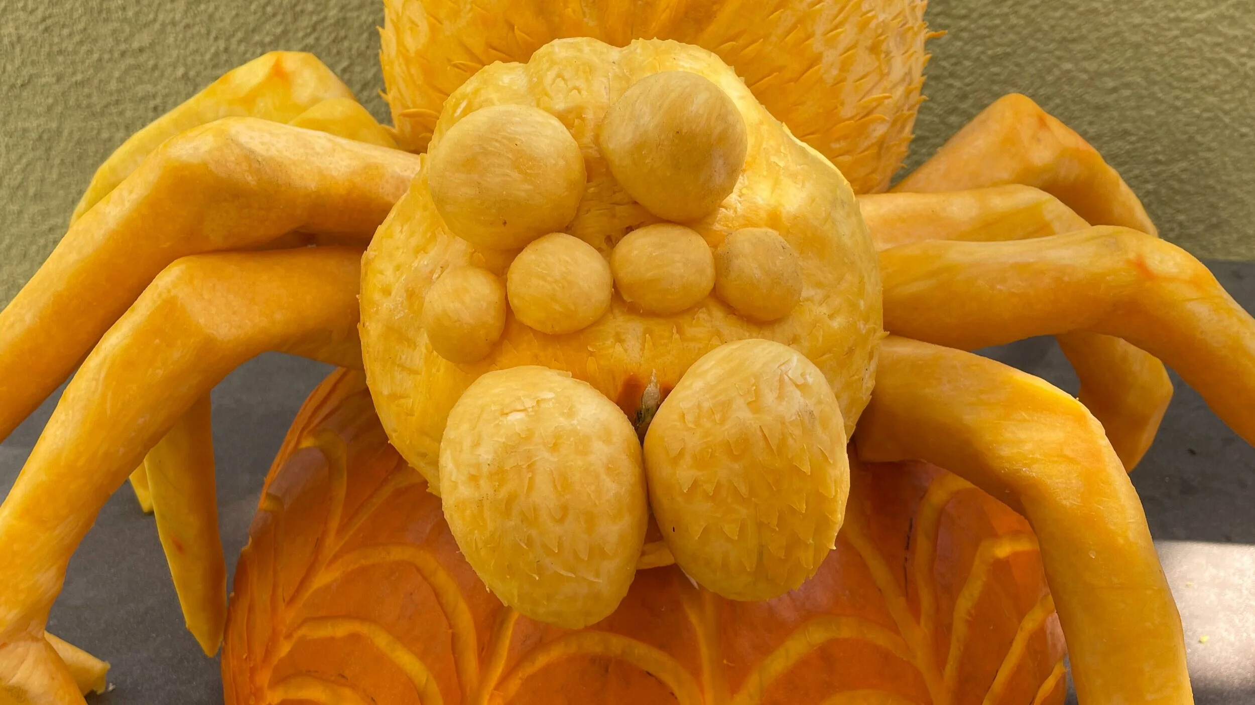 My arachnophobia pumpkin with a spider eating someone’s eyeball.